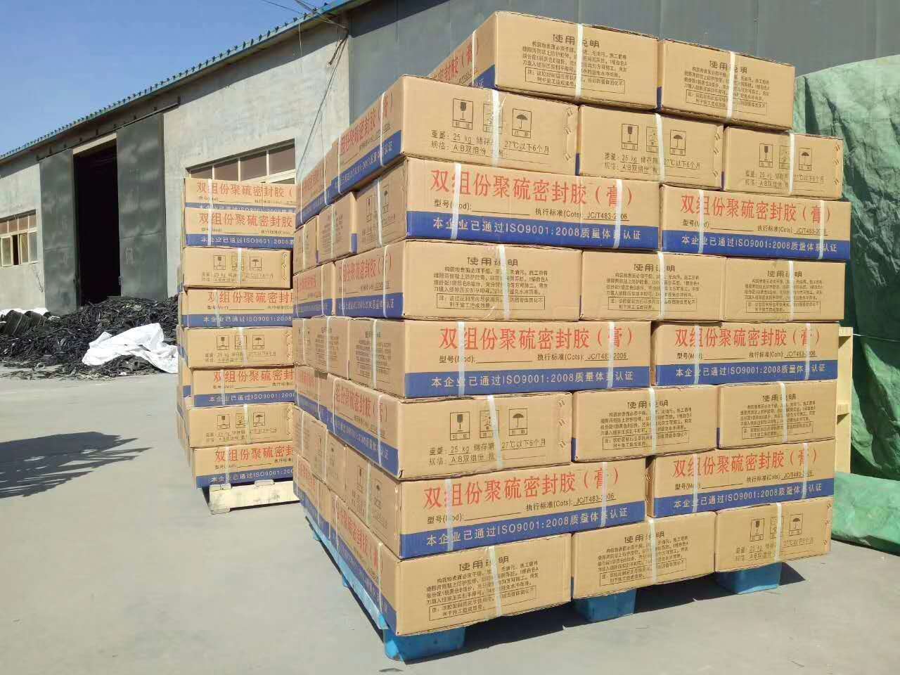 聚硫密封膏箱內(nèi)有一桶白聚硫膠和一桶黑固化劑充分?jǐn)嚢杈鶆蛑钡綗o色差為止。將雙組份聚硫密封的AB膠同時(shí)倒